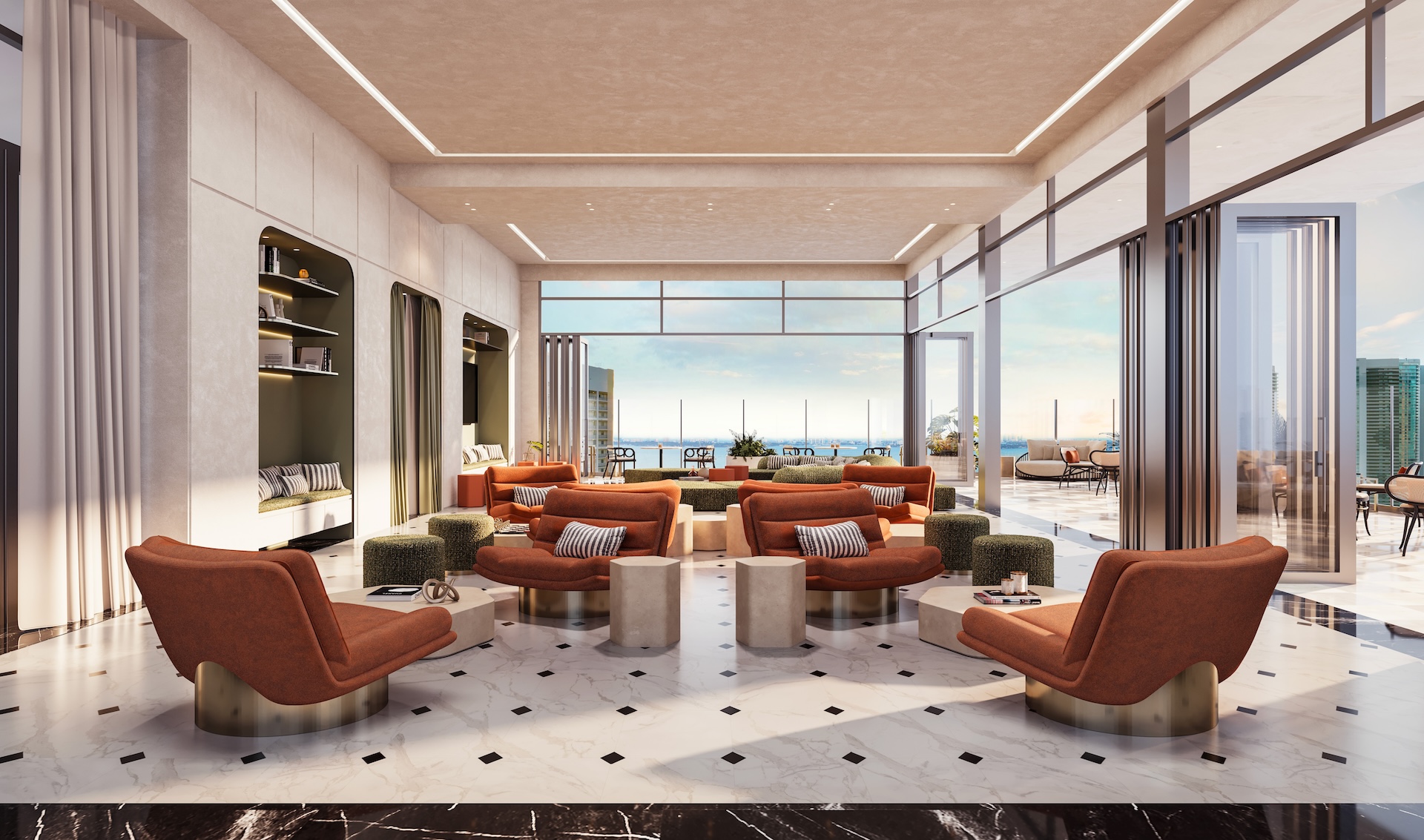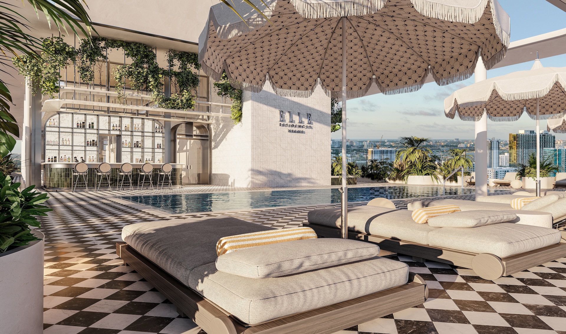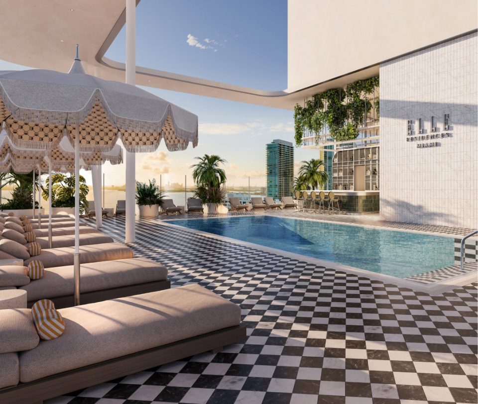 The top level of ELLE Residences features a lap pool with incredible views of Biscayne Bay and Miami Beach, where you can soak up the sun and relax above it all.